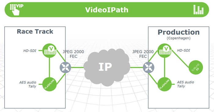 The objective was to have the minimum amount of people involved in the production. On-site, at the race-track, there would be just one cameraman, one commentator and one reporter. In the central production facilities, there would be just one operator producing the show, with one host and one guest in the studio. The production would take place over IP links between the race-track(s) and the central facilities.