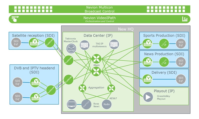 Nevion’s VideoIPath handles the orchestration and control of the whole network, enabling signals to flow seamlessly between the IP and SDI parts. The broadcast control, i.e. the user-interface for the production team, is Nevion’s Multicon.