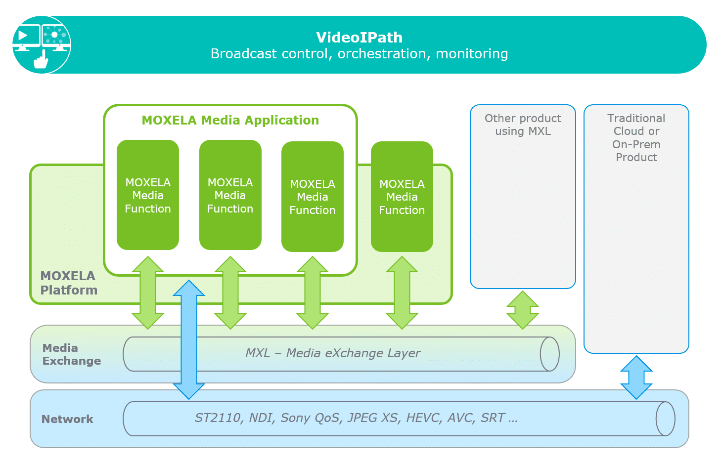Through tight integration with VideoIPath, MOXELA enables unified control, orchestration, virtualization, and monitoring of media applications and systems, including equipment from Sony and third‑party suppliers, across both on‑prem and cloud environments.