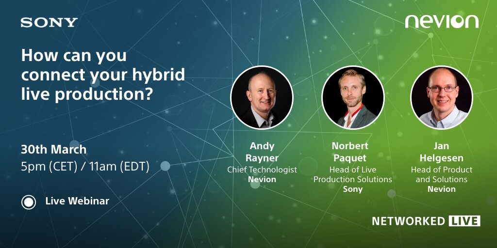 In this webinar, hosted by Nevion Chief Technologist, Andy Rayner, a panel of Sony and Nevion experts will discuss the crucial role played by media transport, and resource and network orchestration in enabling a hybrid on-premise and Cloud live production. They will consider the challenge posed by the blurring of LANs, WANs, 5G network, and the connectivity into, within and out of the Cloud. Using short case studies and highlighting key products and technologies, the panel share Sony and Nevion’s Networked Live capabilities in delivering the workflow-transforming connectivity required in hybrid live production.